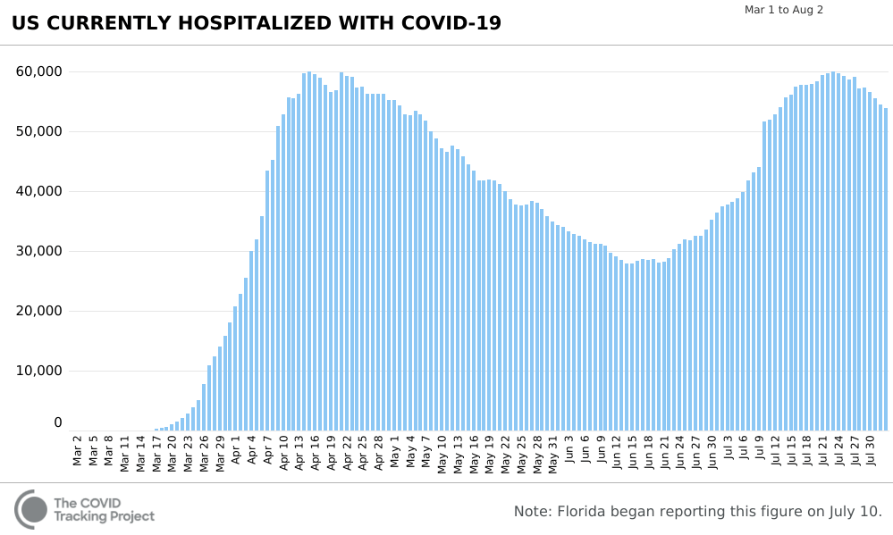 In California, we appear to be on the right path of the curve, as well. Daily infections peaked at 12,807 however, and as of August 1st, daily COVID-19 cases declined to 6,542 (see chart below).