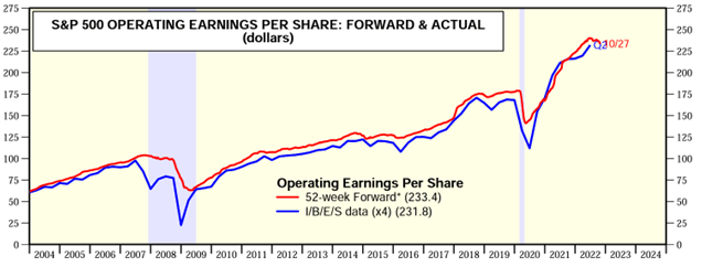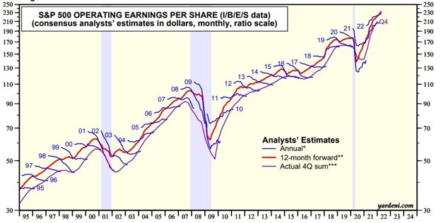 While the calls for a hard economic landing remain, healthy GDP growth (+2.9% in Q4), generationally low unemployment (3.5%), and relatively stable earnings (see chart below) all point to a stable economy with the ability to navigate a soft landing. China’s new reopening of the economy and Europe’s seeming ability of dodging a recession provide additional evidence for a soft landing scenario.