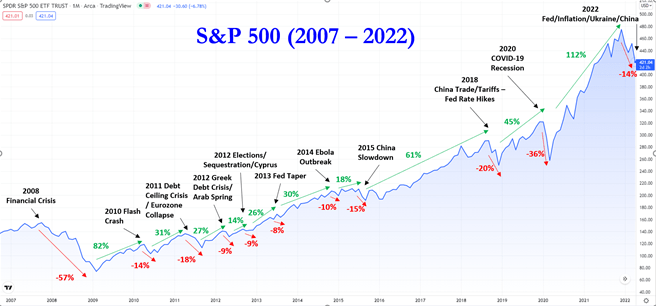 For long-term stock investors who have reaped the massive +520% rewards from the March 2009 lows, they understand this gargantuan climb was not earned without some rocky times along the way. As you can see from the chart below, there have been no shortage of issues and events to worry about over the last 15 years (2007 – 2022):
