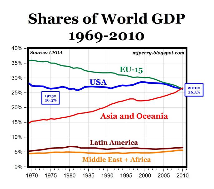 So while emerging markets, like those in Asia, continue to gain a larger slice of the global GDP pie, Mark Perry at Carpe Diem shows how the U.S has maintained its proportional slice of a growing global economic pie, over the last four decades.