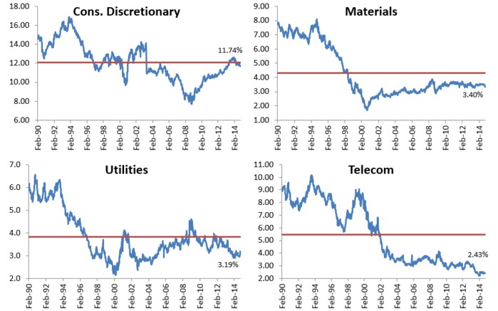 While these and other devices (see SHGR Holy Grail) are great for guesstimating the direction of longer-term stock prices, sector weightings are also great tools for identifying both overheated and unloved segments of the market. Take an extreme example, such as the S&P 500 Technology historical sector weighting in the year 2000. As you can see from the Bespoke Investment charts, the Technology sector went from about a 5% weighting of the overall market in the early 1990s to around 36% at the 2000 peak before dropping back down to 15% after the Tech Bubble burst. If you fast forward to the 2008-2009 Financial Crisis, we saw a similar “bubblicious” phenomenon rupture in the Financial sector. During 1980 the Financial segment accounted for approximately 5% of the total S&P 500 Index market capitalization in 1980 and skyrocketed to a peak of 23% in 2007, thanks in large part to a three decade bull-run in declining interest rates coupled with financial regulators asleep at the oversight switch.