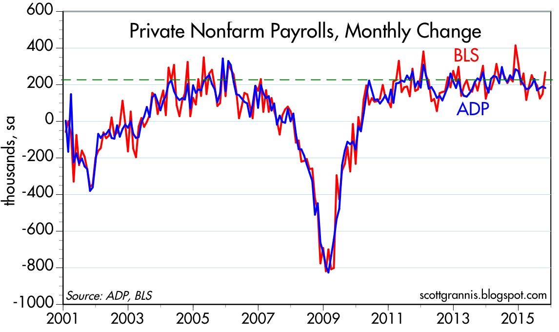 The BLS’s estimate of private sector employment tends to be more volatile than ADP’s, and both tend to track each other over time. That further suggests that the BLS jobs number—to be released early tomorrow—has a decent chance of beating expectations.