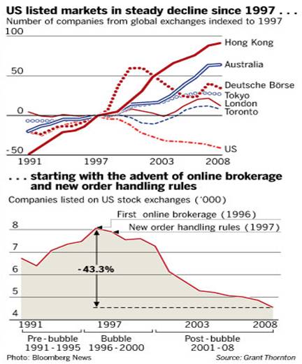 The heightened convoluted nature to our country’s exchange-based financial system can be traced back to the establishment of Regulation NMS, which was passed by the SEC in 2005 and implemented in 2007. The aim of this regulatory structure was designed to level the playing field through fairer trade execution and the creation of equal access to transparent price quotations. However, rather than leveling the playing field, the government destroyed the playing field and fragmented it into many convoluted pieces (i.e., exchanges) – see Wall Street Journal article and chart below.
