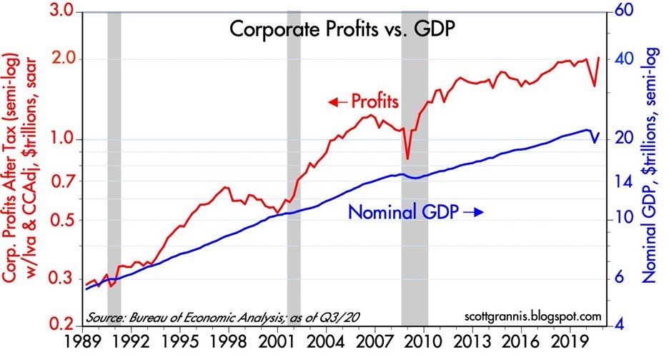 - Record Corporate Profits (see chart below): The United States economy is the envy of the world, and the reason why is evident by the 65-year chart below showing record corporate profits and GDP. If you were an entrepreneur, where would you choose to start your company? China? Japan? UK? Russia? There’s plenty of room for improvements in our country’s policies, but there’s a reason the U.S. dominates in creating the largest and most profitable multi-trillion companies in the world.