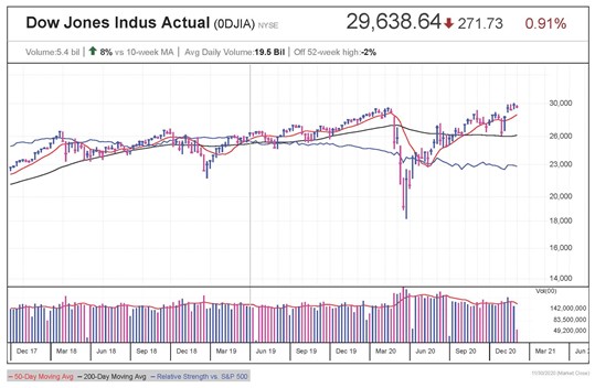 Investor optimism was further buoyed by 95%-effective vaccine data released by pharmaceutical companies, Pfizer, Inc. (PFE), BioNTech (BNTX), and Moderna Inc. (MRNA), which helped the stock market surge last month to an all-time record high of 30,000 in the Dow Jones Industrial average (see chart below) before slightly dipping at the end of the month to 29,638 . More specifically, the Dow soared +12% (3,137 points) for the month; the S&P 500 index 11%, and the NASDAQ +12%. For the year, the Dow, S&P, and NASDAQ have climbed +4%, +12%, and +36%, respectively.