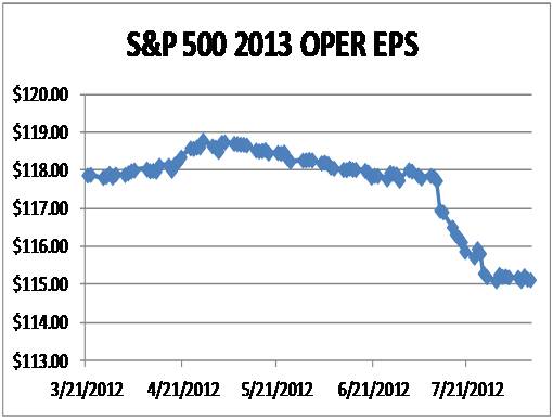 So how can stocks be up in double digit percentage terms when we face an uncertain U.S. presidential election, a fiscal cliff, unsustainable borrowing costs in Spain, and S&P 500 earnings forecasts that are sinking like a buried hiker in quicksand (see chart below)?
