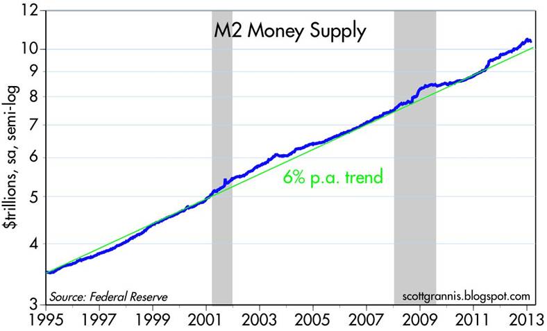 Impassioned critics of the Federal Reserve and its Chairman Ben Bernanke would have you believe the money supply is exploding, and hyperinflation is just around the corner. It’s difficult to quarrel with the trillions of dollars created by the Fed’s printing presses via QE1/QE2/QE3, but the fact remains that money supply growth has continued at a steady growth rate – not exploding (see Calafia Beach Pundit chart below).