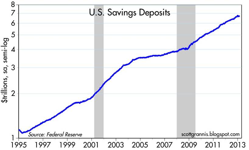 Why no explosion in the money supply? Simply, the trillions of dollars printed by the Fed have sat idly in bank vaults as reserves. Once nervous consumers stop hoarding trillions in cash held in savings deposit accounts (see chart below) and banks begin lending at a healthier clip, then money supply growth will accelerate. By definition, money supply growth in excess of demand for goods and services (i.e., GDP) is the main cause of inflation.