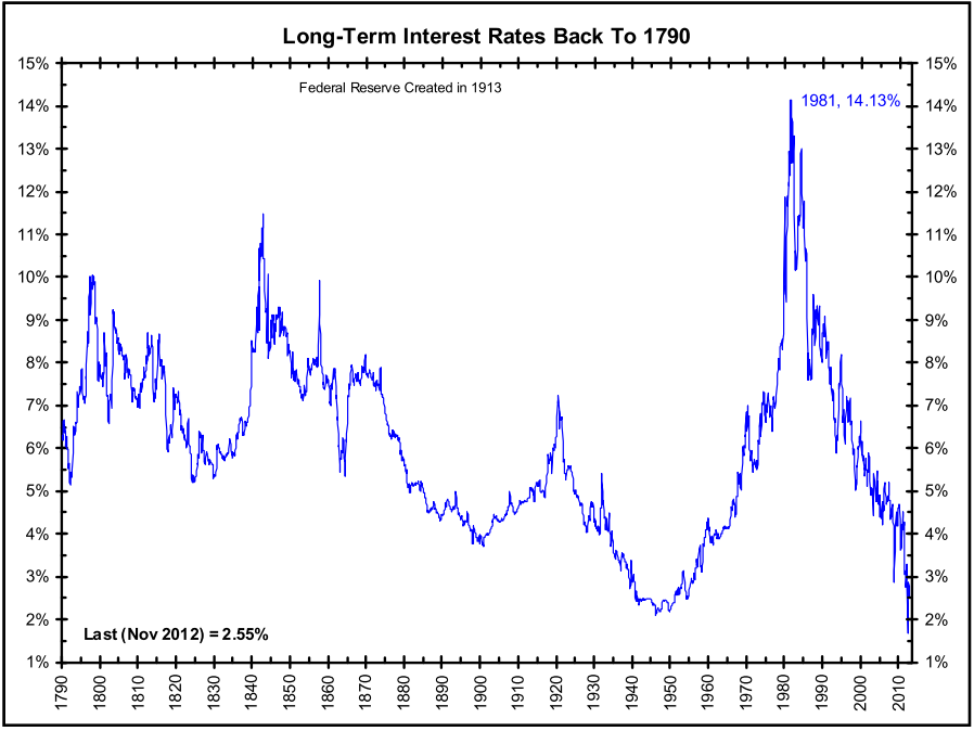 The same time-value-of-money principle applies to any asset, whether you are referring to gold, cars, houses, private businesses, stocks, or other assets. The mathematical fact is, all else equal, a rational person will always pay more for an asset when interest rates are low, and pay less when interest rates are high. As the 200-year interest chart below shows, current long-term interest rates are near all-time lows.