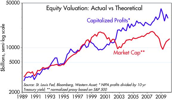 “Note that profits doubled from 1998 to 2009, yet the S&P 500 index today is still lower than it was at the end of 1998…equities continue to be extremely undervalued. Another way of looking at this is that the market is discounting current profits using an 8% 10-yr Treasury yield, or a 50% drop in corporate profits from here. Simply put, according to this model the market is priced to some very awful assumptions.”