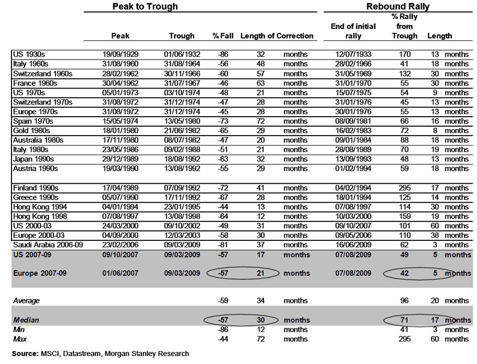 An interesting study was done by Morgan Stanley Europe, in which they looked at the last 19 bear markets and subsequent rallies. I’m not sure how much weight you can put on these results since every bear market is unique in its own right, nonetheless it provides a good frame of reference for debates.