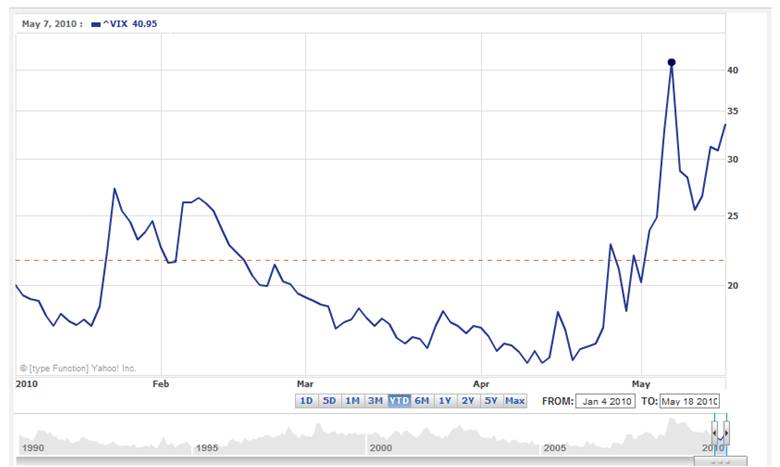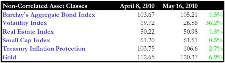 Still fresh in the minds of investors are the open wounds created by the incredible volatility that peaked just a little over a year ago, when the price of insurance sky-rocketed as measured by the Volatility Index (VIX). Even though equity markets troughed in March of 2009, earlier the VIX reached a climax over 80 in November 2008. With financial institutions falling like flies and toxic assets clogging up the lending pipelines, virtually all asset classes moved downwards in unison during the frefall of 2008 and early 2009. The traditional teeter-totter phenomenon of some asset classes rising simultaneously while others were falling did not hold. With the recent turmoil in Greece coupled with the “Flash Crash” (read making $$$ trading article) and spooky headline du jour, the markets have temporarily reverted back to organized chaos. What I mean by that is even though the market recently dove about +8% in 8 days, we saw the teeter-totter benefits of diversification kick in over the last month.
