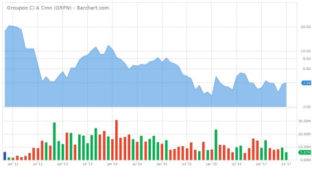 Groupon Inc. (GRPN): Unlike Snap and Blue Apron, Groupon also has the flattering distinction of reporting an accounting profit, albeit a small one. However, on a cash-based analysis, Groupon looks a little better than the previous two companies mentioned, if you consider an annual -$7 million cash burn “better”. Competition in the online discounting space has been fierce, and as such, Groupon has experienced a competitive haircut in its share price. Groupon’s original IPO price was $20 in January 2011 before briefly spiking to $31. Today, the stock has languished to $4 (-87% from the 2011 peak).