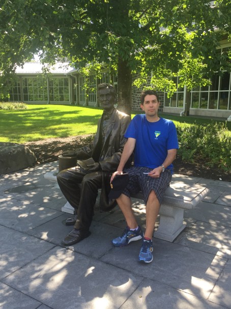 Looking for enlightenment as I sit next to Abe outside the Gettysburg Museum.