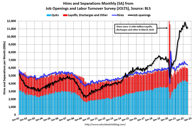 The economy’s ravenous appetite for workers can also be found in the just-released JOLTS job opening data (see chart below), which shows there are 11.2 million job openings, a total that is almost double the number of available workers (5.7 million).